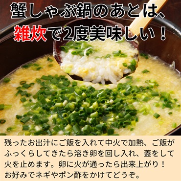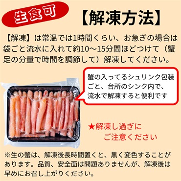※蟹の種類で解凍の時間等が違います。こちらは、ずわい蟹の解凍方法です。 解凍する時は、常温では1時間くらい、お急ぎの場合は、袋ごと流水に入れて約10~15分間ほどつけて(蟹脚の分量で時間を調節して)解凍してください。解凍し過ぎにご注意ください。