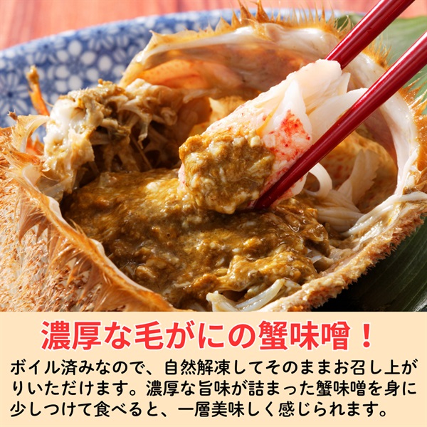 ※蟹の種類で解凍の時間等が違います。こちらは、毛がにの解凍方法です。 ①「冷蔵庫」で自然解凍してください。 目安は約半日以上、1日未満です。 冷凍のボイル毛がには、冷蔵庫でゆっくり時間をかけて自然解凍すると、ドリップの流出を防ぎ美味しくいただけます。 乾燥しないように冷凍毛がにをキッチンペーパーで包んで、水切りバットの上にのせて、冷蔵庫に入れます。 ②表面の氷が手で落とせるようになったら 冷凍の蟹は、水分の乾燥を防ぎ、鮮度を保つため、表面を氷の膜で覆われています。 解凍時には、蟹の甲羅を下にして(腹側が上)、少し溶けた状態で、関節を動かしてみてください。 蟹の表面の氷が手でポロポロと落とせるようになったら食べごろです。 ③解凍したその日のうちにお召し上がり下さい。 解凍した分を食べきれず、冷蔵庫に入れると、水分と蟹の旨みが抜けて、身がパサパサになります。当日お召し上がりになる分だけ解凍してください。 ※堅毛がには身がびっしり詰まっており、他の蟹より、解凍に時間がかかります。 【急ぎで解凍する方法】 蟹の入ったビニール袋ごと、流水で解凍してください。 水は空気よりも熱伝導が良いので、流水にさらすと30~40分程度で解凍できます。 流水での解凍は7割程度までに止めておくと、解凍しずぎにならず、おいしくお召し上がりいただけます。