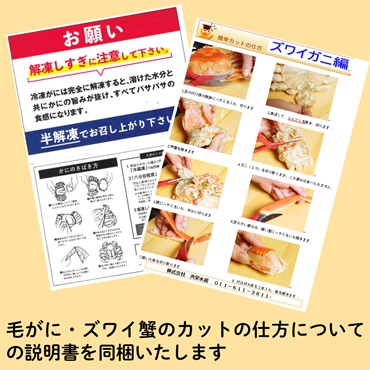 ※蟹の種類で解凍の時間等が違います。こちらは、ずわい蟹姿ボイルの解凍方法です。 ①「冷蔵庫」で自然解凍してください。 目安は約数時間です。 冷凍のボイルずわいがには、冷蔵庫でゆっくり時間をかけて自然解凍すると、ドリップの流出を防ぎ美味しくいただけます。 乾燥しないように冷凍ずわい蟹をキッチンペーパーで包んで、水切りバットの上にのせて、冷蔵庫に入れます。 ②表面の氷が手で落とせるようになったら 冷凍の蟹は、水分の乾燥を防ぎ、鮮度を保つため、表面を氷の膜で覆われています。 解凍時には、蟹の甲羅を下にして(腹側が上)、少し溶けた状態で、関節を動かしてみてください。 蟹の表面の氷が手でポロポロと落とせるようになったら食べごろです。 ③解凍したその日のうちにお召し上がり下さい。 解凍した分を食べきれず、冷蔵庫に入れると、水分と蟹の旨みが抜けて、身がパサパサになります。当日お召し上がりになる分だけ解凍してください。 【急ぎで解凍する方法】 蟹の入ったビニール袋ごと、流水で解凍してください。 水は空気よりも熱伝導が良いので、流水にさらすと10~15分程度で解凍できます。 流水での解凍は7割程度までに止めておくと、解凍しずぎにならず、おいしくお召し上がりいただけます。