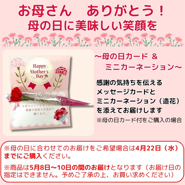 【販売者】 060-0010 札幌市中央区北10条西24丁目 株式会社共栄水産 事業責任者:山室昌子 011-611-3811 http://www.kyoueisuisan.co.jp/catalog/default.php 【引き渡し時期】 ご注文から7営業日以内に発送します ※母の日カード付を選択の場合を除く 【宅配業者・配送形態】 ヤマト運輸・クール便(60サイズ) 【お支払い方法】 1.クレジットカードクレジットカードは、ご注文時にお支払いが確定します。 2.代金引換(利用代金に応じて手数料がかかります) 代金引換は、商品受取時にヤマト運輸に現金にてお支払いください。(ご注文者以外のお届けにはお使いになれません) 3.NP後払い(請求書発行手数料248円がかかります) 商品お届け後、NP社より請求書をお届けします。請求書発行14日以内にコンビニエンスストア・ゆうちょ銀行・銀行・LINE Payなどでお支払いください。お支払い期限は請求書にも記載しております。(ゆうちょ銀行、銀行への振込の際、別途振込手数料がかかる場合があります。(ご利用者様負担) 【返品・キャンセル】 ご購入者様都合による返品・交換はお受けできません。ご注文の品と異なる商品が届いた場合、商品の破損・傷みなどの品質上の問題があった場合に限り、商品の交換を承ります。商品到着から3日以内にご連絡ください。