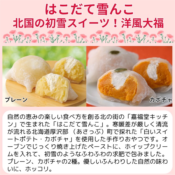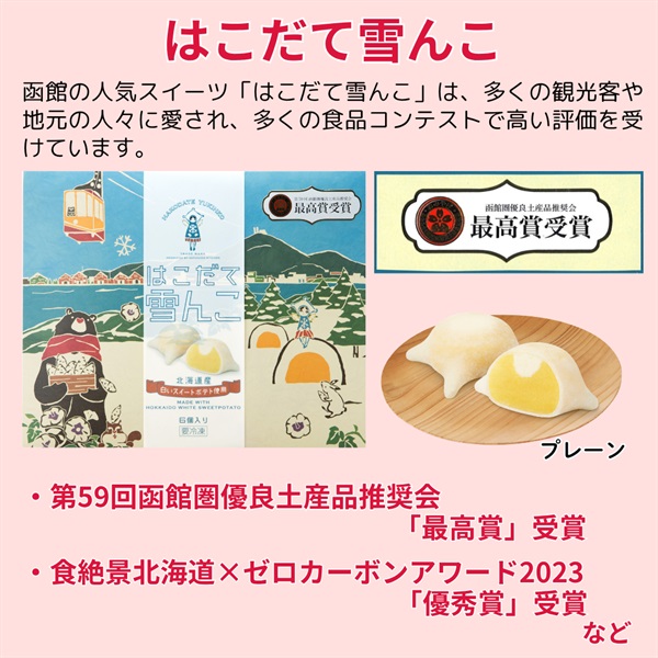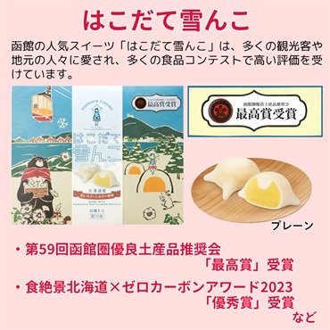 【はこだて雪んこ プレーン】さつまいも(北海道厚沢部町産)、求肥[オリゴ糖、砂糖、もち米粉、白玉粉、澱粉]、牛乳、砂糖、バター、卵黄(卵を含む)、生クリーム/ソルビトール、加工でん粉、乳化剤、炭酸Ca、炭酸Mg 【はこだて雪んこ カボチャ】かぼちゃ(北海道厚沢部町産)、求肥[オリゴ糖、砂糖、もち米粉、白玉粉、澱粉]、牛乳、砂糖、バター、卵黄(卵を含む)、生クリーム/ソルビトール、加工でん粉、乳化剤、炭酸Ca、炭酸Mg 【余市が薫るアップルパイ】りんご(北海道)、小麦粉、マーガリン、砂糖、バター、卵、希少糖、アーモンドプードル、シナモン、食塩、(一部に小麦粉・卵・乳成分・大豆・りんご・アーモンドを含む)